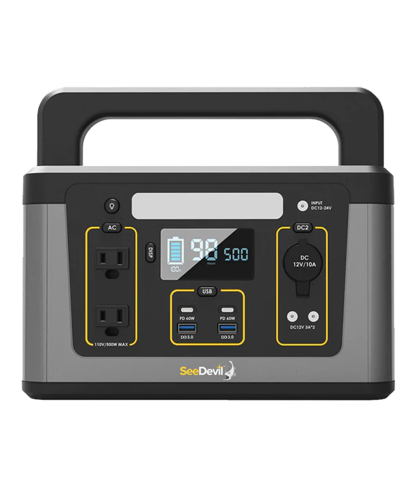 Portable & Eco-Friendly. The SeeDevil™ gas-free portable power line is green, efficient and easy to use. Weighing in at only 12 lbs, the 500W Portable Power Station is easily transported and stowed away.